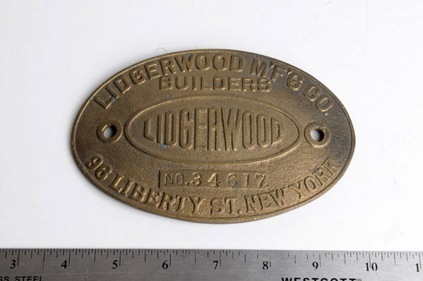 Additional Info: Lidgerwood solid cast brass name plate. plate has a slight convex to it and is in great shape. Excellent display piece.